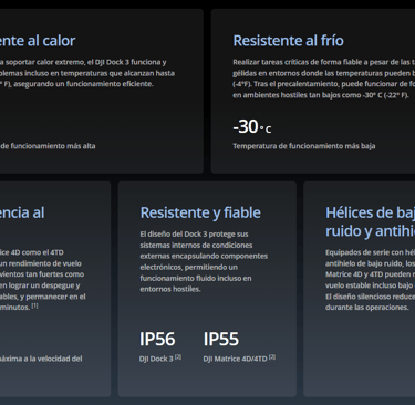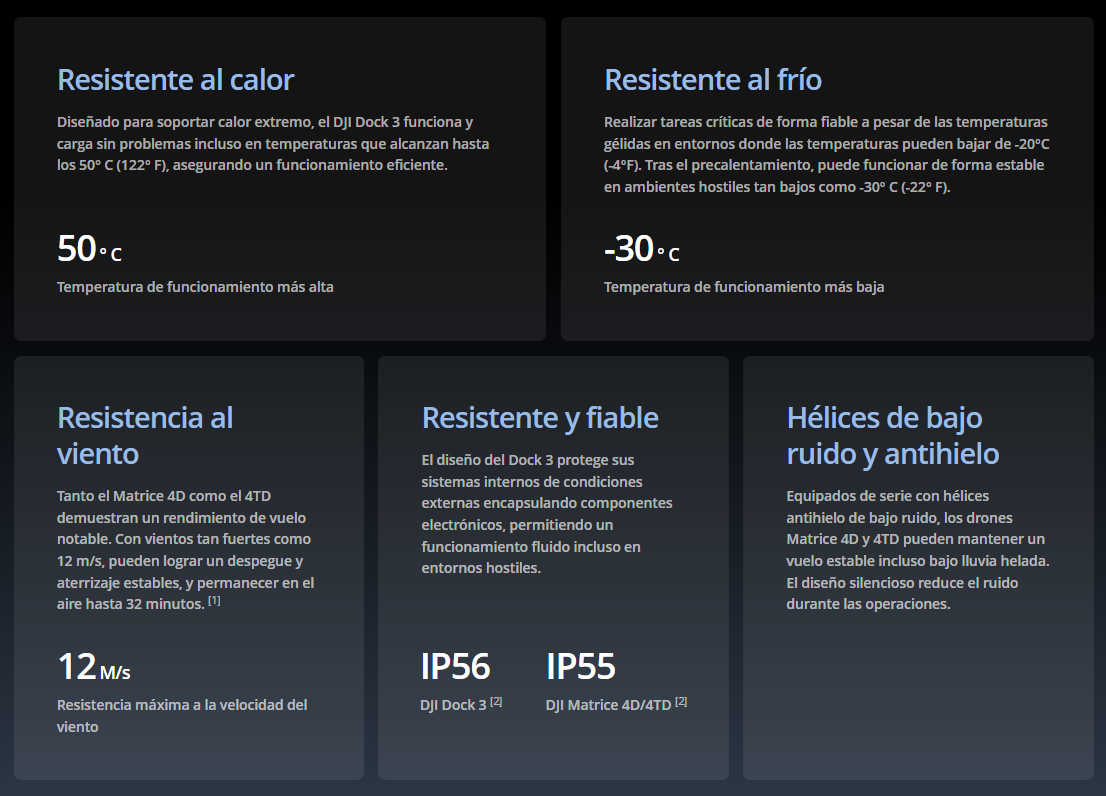 2. DJI Dock 3 tiene certificación IP56, y la DJI Matrice 4D/4TD tiene certificación IP55. Ambos fueron probados bajo condiciones de laboratorio controladas, con la puerta del armario de distribución del muelle cerrada y los tornillos apretados. La clasificación IP no es efectiva de forma permanente y puede disminuir debido al desgaste del producto.