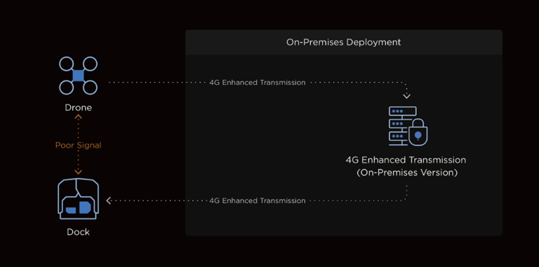 Con DJI Cellular Dongle 2 [21], la aeronave puede conectarse a redes 4G. En entornos operativos complejos, la red 4G trabaja en conjunto con el sistema de transmisión de vídeo O4+ para garantizar una transmisión estable y mejorar la seguridad en vuelo. El servicio de transmisión de vídeo mejorado 4G puede desplegarse de forma privada y utilizarse junto con la versión local de FlightHub 2 para mejorar aún más la estabilidad y seguridad de la transmisión de datos.