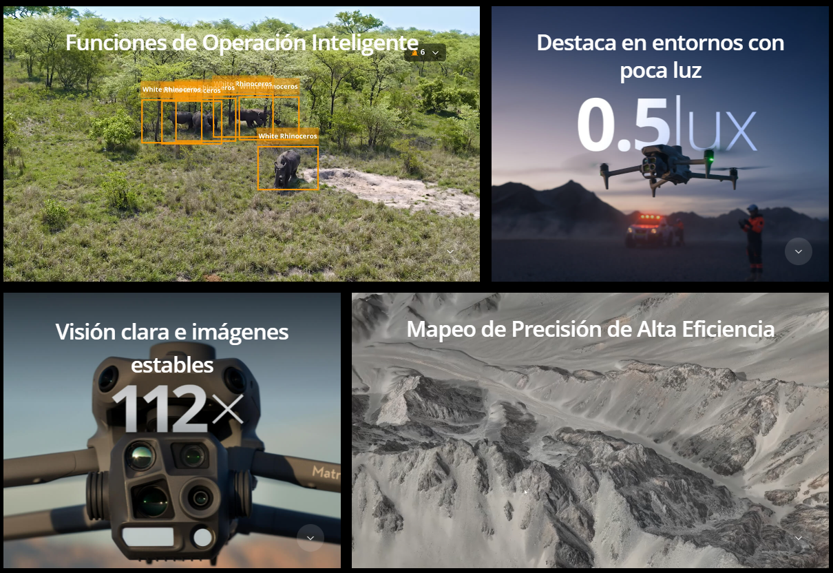 ** Todos los vídeos y fotos de esta página se grabaron en estricto cumplimiento de las leyes y normativas locales. Las demos, incluidas las faunas, fueron filmadas desde una distancia segura y se usan solo como referencia. Por favor, respete las leyes y normativas locales y asegúrese de que la aeronave haya obtenido las certificaciones correspondientes antes de volar.