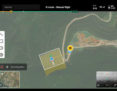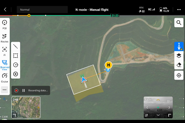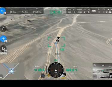 DJI Pilot 2 puede resaltar la posición central del fotograma y la zona del suelo observada. Puede mostrar el área cartografiada en el mapa, lo que lo hace especialmente útil para patrullas y operaciones de rescate en terrenos montañosos sin puntos de referencia claros.