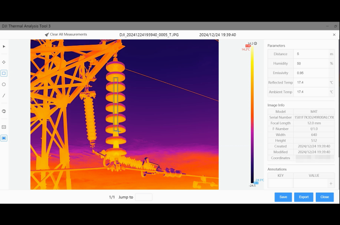 Tras completar las operaciones de imagen térmica [2] con Matrice 4T, puedes utilizar la herramienta de análisis térmico DTAT 3.0 para marcar, analizar y procesar imágenes, detectando puntos de temperatura anormales.